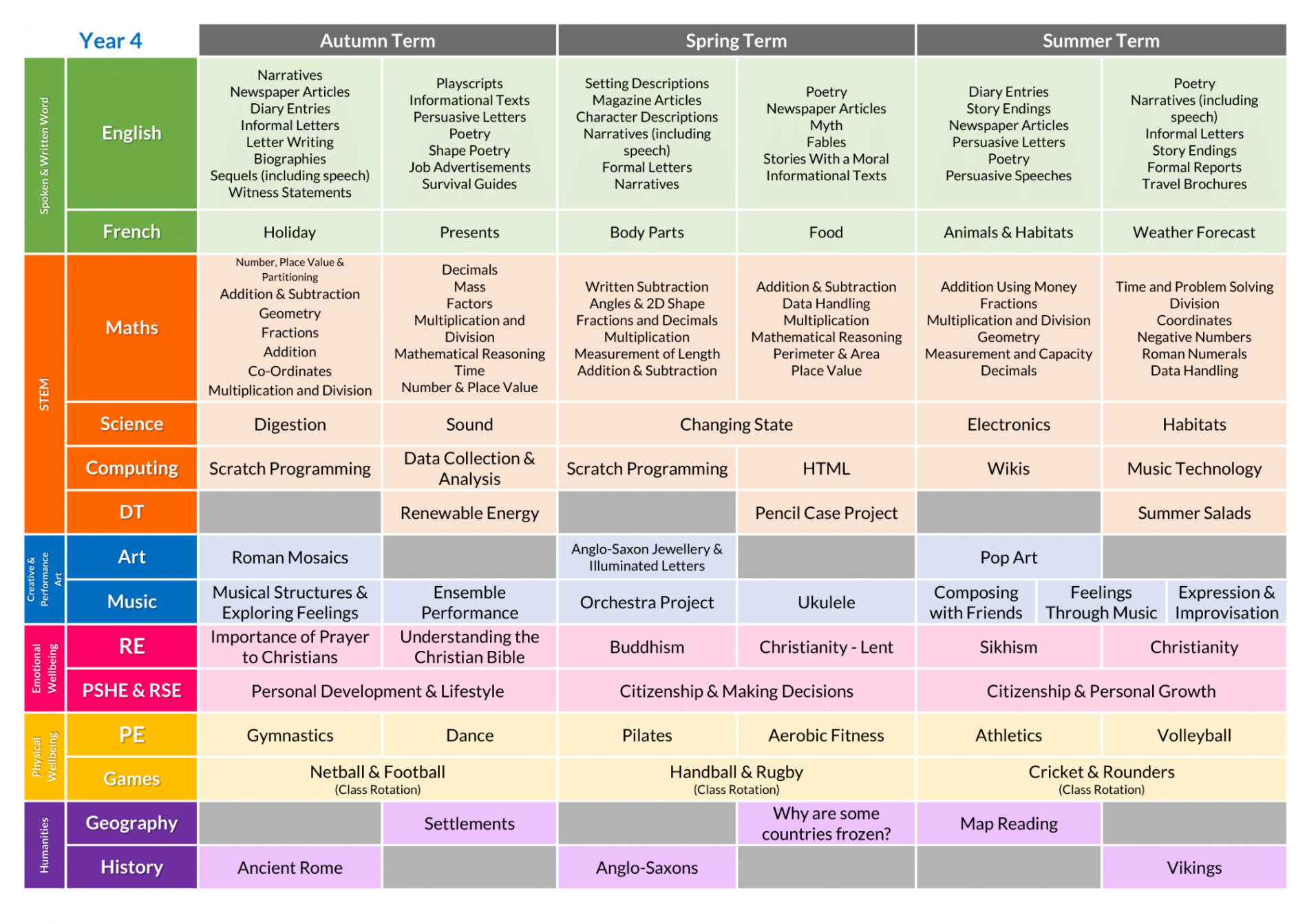 Your child will study a wide variety of topics as part of their curriculum studies at Normandy Village School. Please see below details of the curriculum content that your child will study in Year 4.